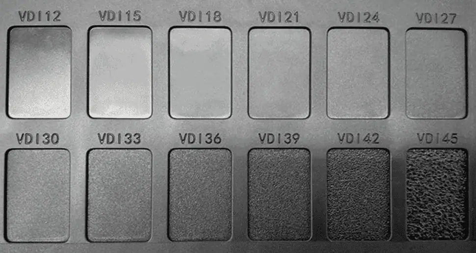 VDI is an international standard for mould texturing of matte surfaces. It is mainly processed by Electrical Discharge Machining (EDM) when mould machining.