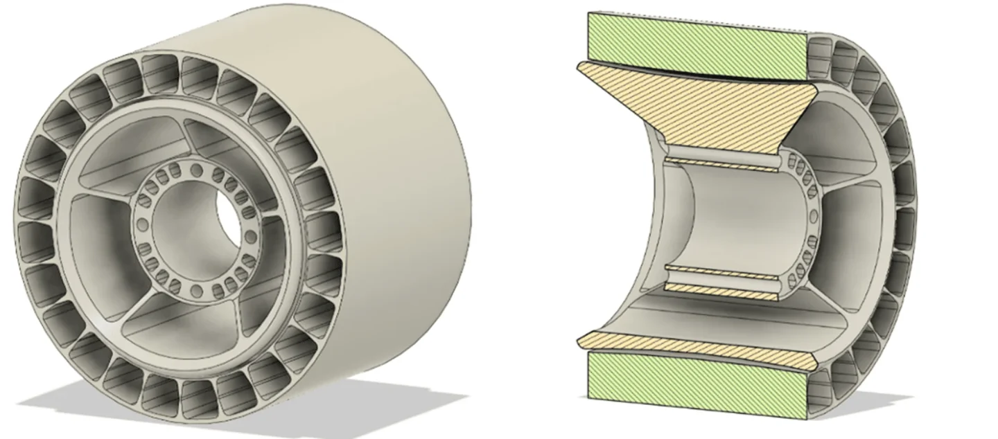 - Revised lattice: Our initial design showed uneven deformation around the circumference. Engineers recommended a more symmetric, radial internal strut layout, inspired by Michelin’s Uptis prototype.